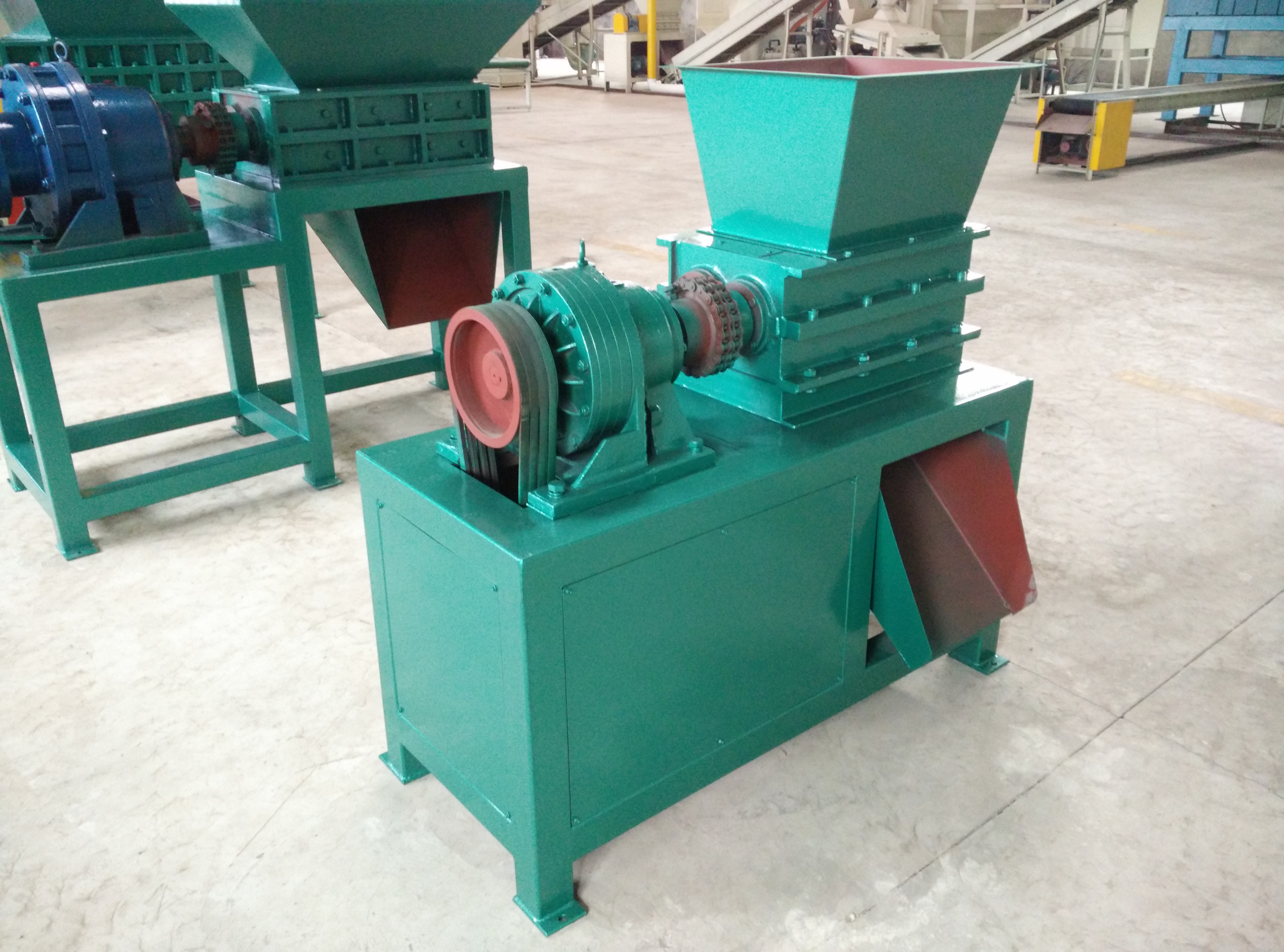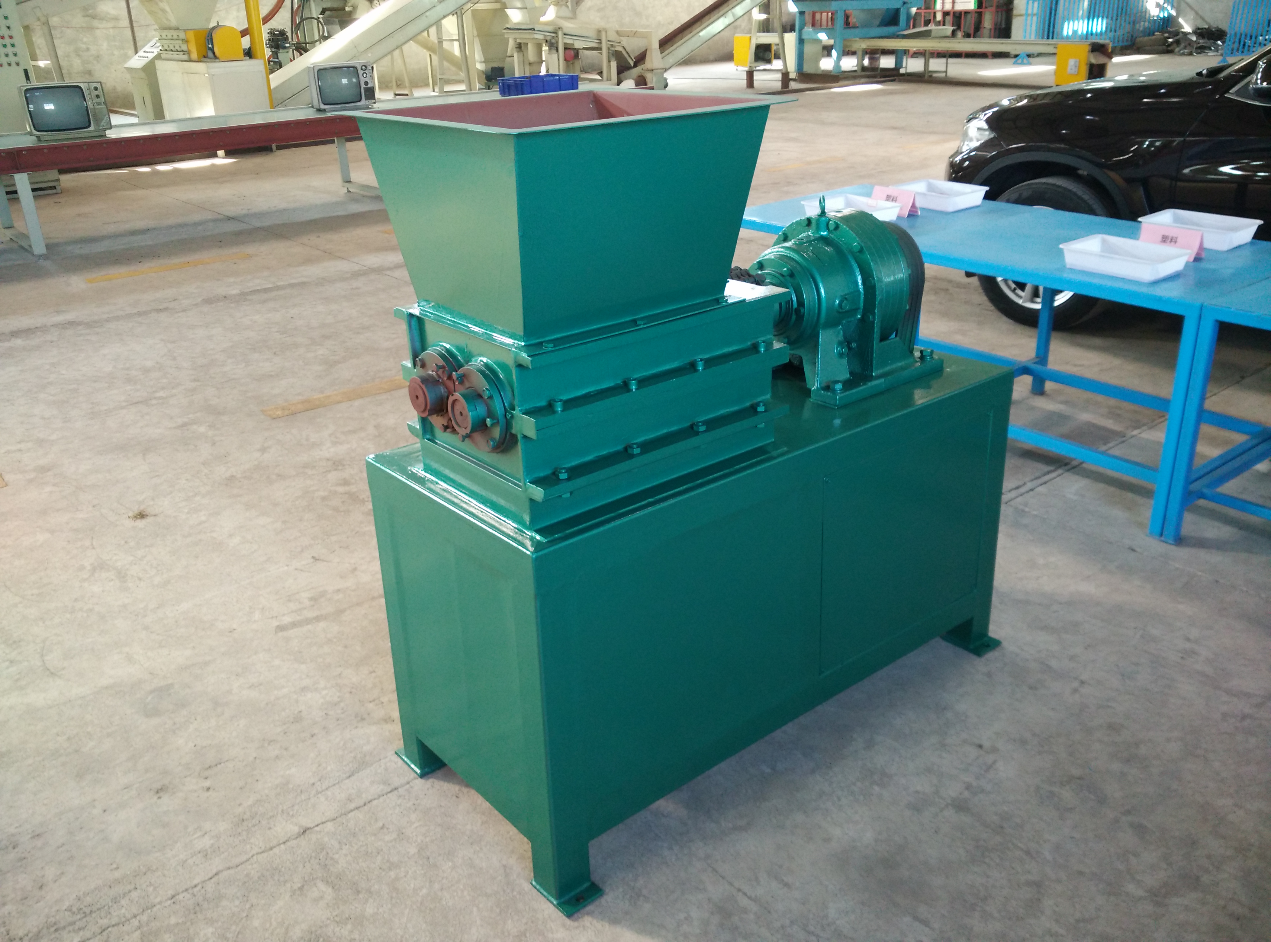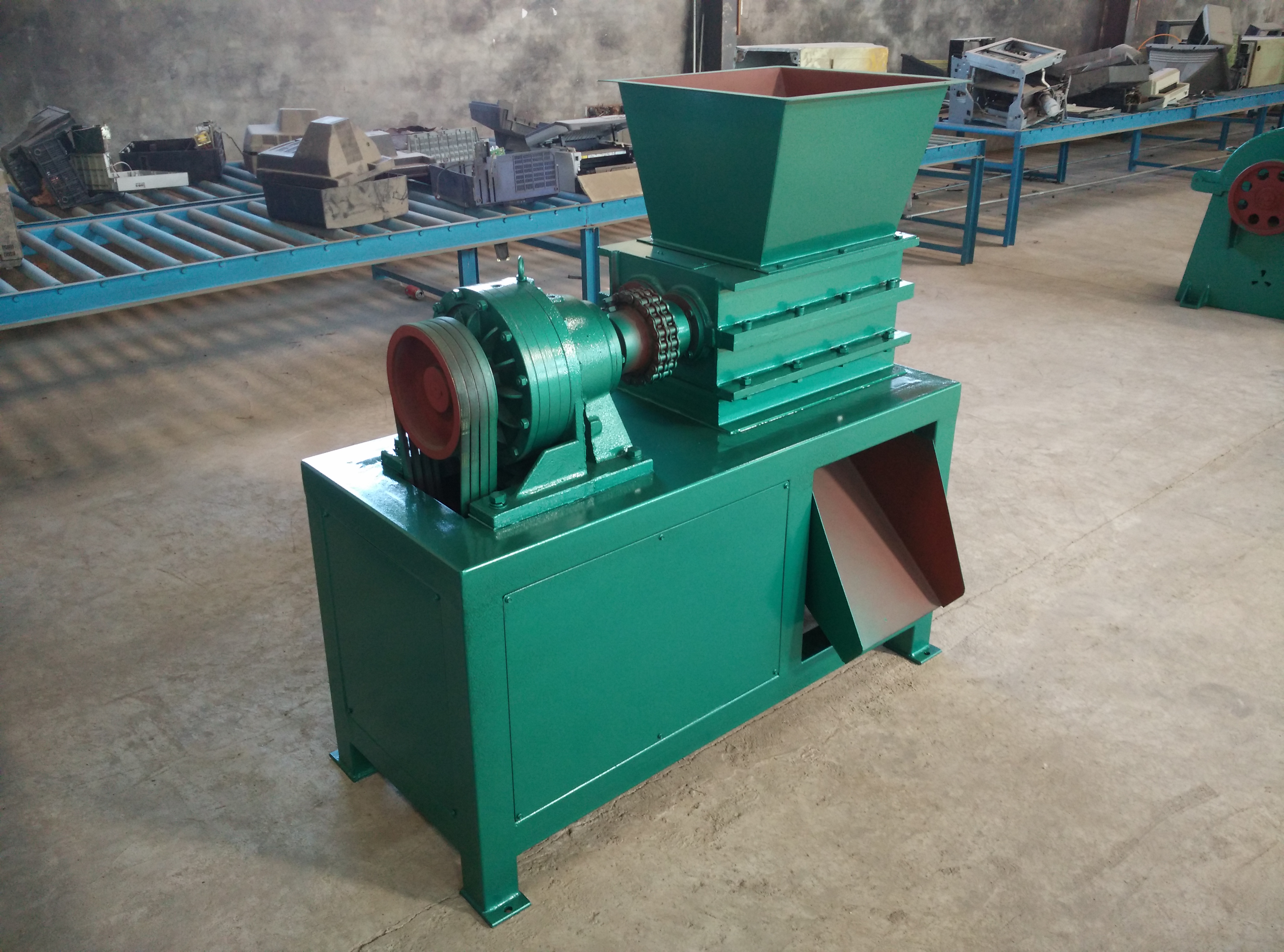 該機設計新穎、噪音低、扭矩大、用途廣,在破碎過程中,具有拉切、扯斷、擠壓、自動退料,能使各種塑料、廢電線、電纜、印刷電路板、廢舊冰箱、洗衣機、空調、電視、電腦等家電及打印機、復印機、傳真機等辦公用品。廢舊橡膠、工程樹脂、城市廢物、木材、管材、粗大塊料破碎之用,每小時處理量1-10噸。