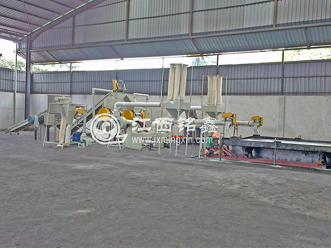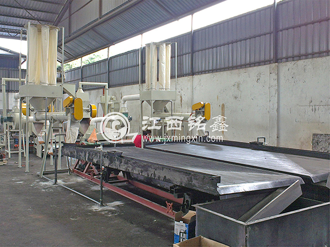 MX600型智能破碎機進行粗破 ---> 皮帶機輸送(磁選機除鐵) ---> MX500型干式銅米機細破(可加除塵系統(tǒng)) ---> MX1200型干式分選機分選出(粗、中、細銅米) ---> 風壓吸塑機將塑料(包含雜質和毛絲銅粉塵等)吸入聚料斗中 ----> 專用螺旋輸送 ---> 專用水選床水選