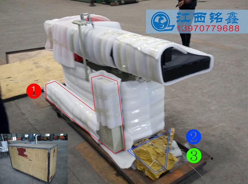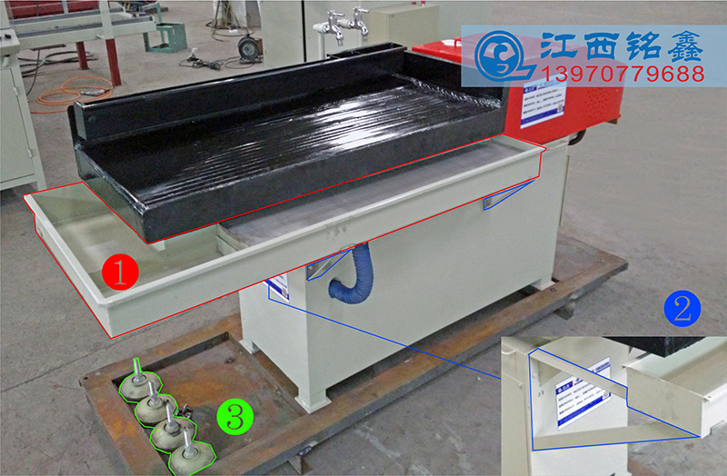 1.設備出廠已裝配調試好、為了便于包裝已把以下幾項配件拆解分裝、①接礦槽、②接礦槽支撐件、③防震墊腳。(圖1)(圖2)