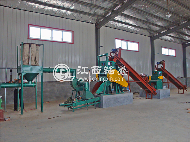 MX600型智能破碎機(jī)進(jìn)行粗破 ---> 皮帶機(jī)輸送(磁選機(jī)除鐵) ---> MX500型干式銅米機(jī)細(xì)破(可加除塵系統(tǒng)) ---> MX1200型干式分選機(jī)分選出(粗、中、細(xì)銅米) ---> 風(fēng)壓吸塑機(jī)將塑料(包含雜質(zhì)和毛絲銅粉塵等)吸入聚料斗中 ----> 專用螺旋輸送 ---> 專用水選床水選